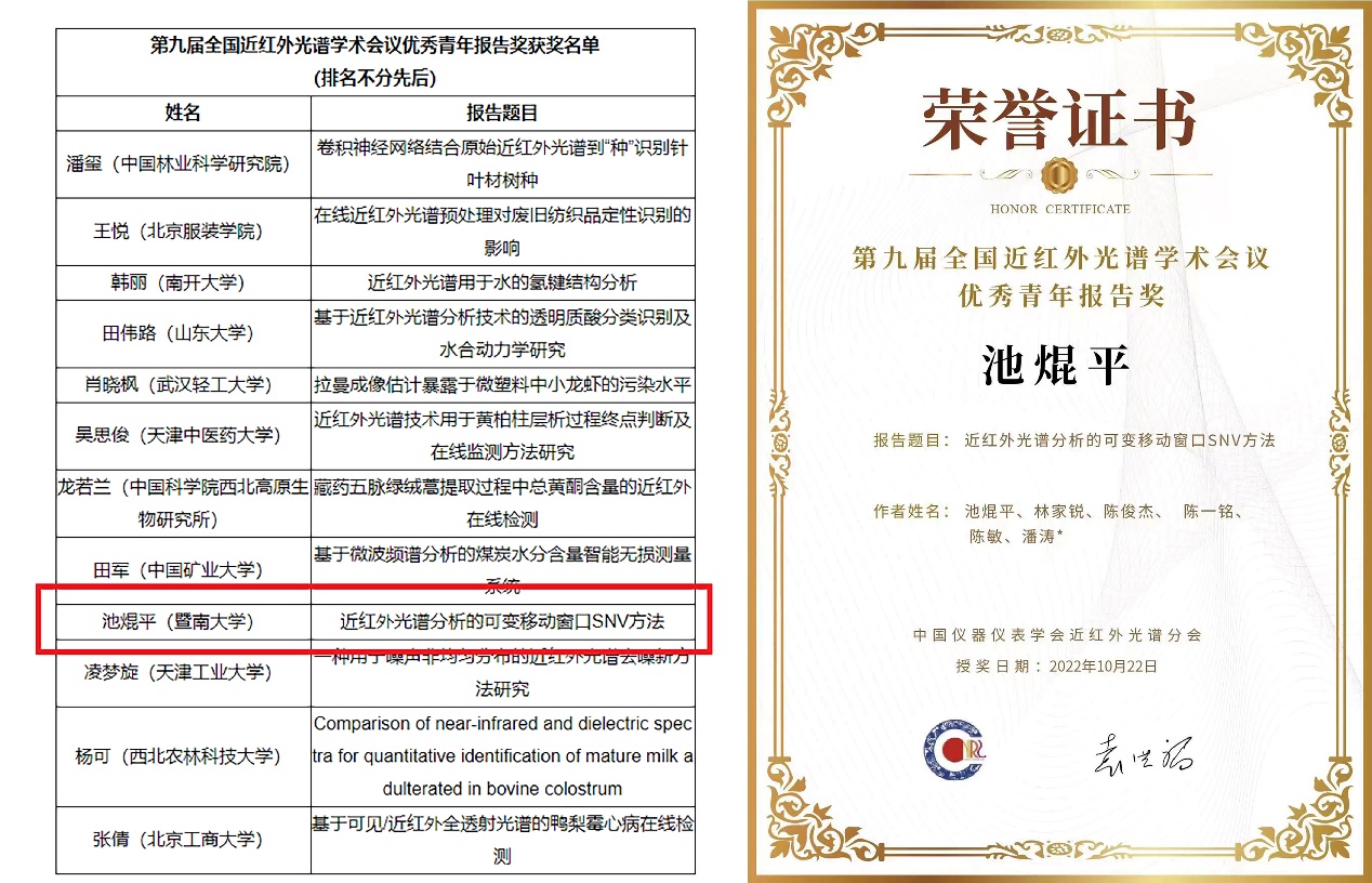 10月22日,由中国仪器仪表学会近红外光谱分会举办的全国第九届近红外光谱学术会议落幕。暨南大学007即时比分 光电信息科学与工程专业2020级科研小组(池焜平、林家锐、陈敏、陈俊杰、陈一铭,指导老师:潘涛教授)完成的论文《近红外光谱分析的可变移动窗口SNV方法》被大会录用为宣读报告,并在72个青年报告中脱颖而出,荣获第九届全国近红外光谱学术会议优秀青年报告奖。