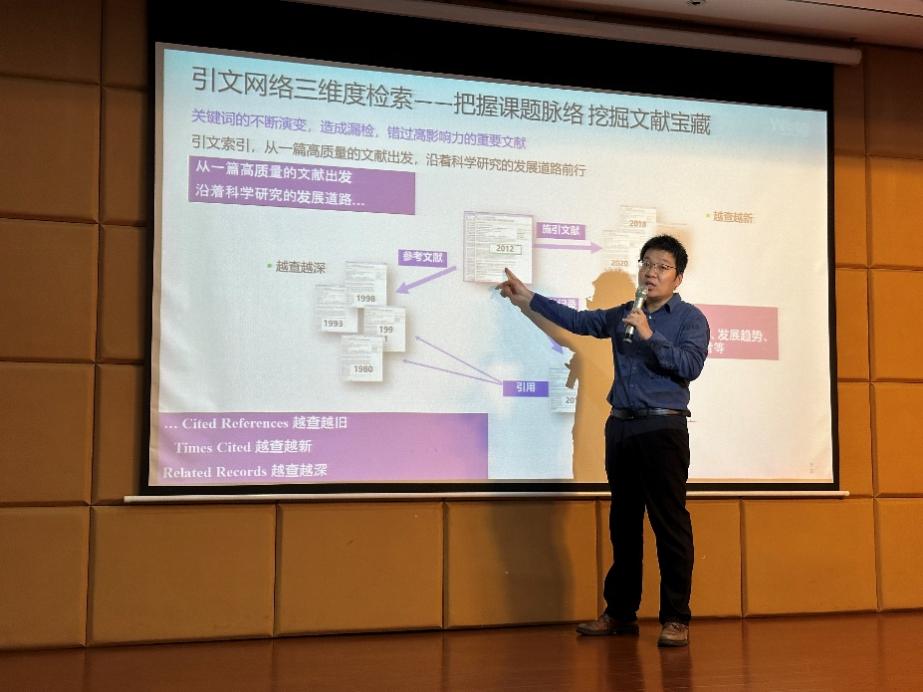 汤敬谦向同学们全面地介绍了图书馆的总体概况,详细讲解了各类软硬件资源,包括图书馆的各楼层设置、自助服务系统、好书荐购等服务。随后,他以“为什么要学习文献检索”为话题引出讲座内容,着重为同学们讲解了各类数据库和电子资源信息。同时对于外文资源等重要资源的检索技巧也进行了详细说明,包括如何通过检索工具精准定位文献、如何合理的利用数据库及搜索引擎等。最后,他强调了学术诚信的重要性。