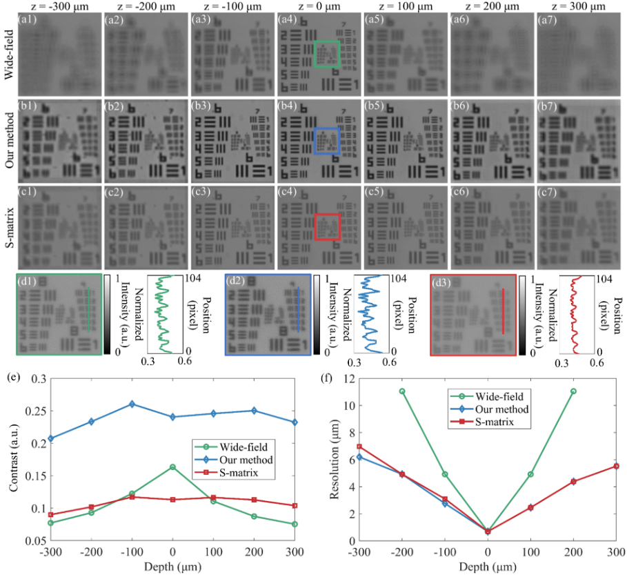 图3.本文所提方法与基于S矩阵的孔径编码光场显微成像方法的性能比较
