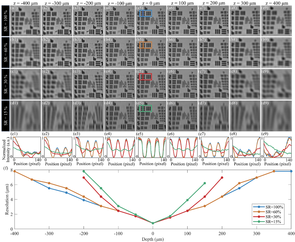 利用频谱图像所具有的能量积聚特性,提出欠采样策略,在不牺牲空间分辨率和景深的前提下,提高光场成像的时间分辨率。实验结果表明(图4),在60%的采样率下,重建的光场图像在景深和空间分辨率方面与采样率为100%下重建的光场图像相当。值得一提的是,本文提出的方法在欠采样时无需使用复杂的迭代优化算法,这不仅简化了计算流程,也提高成像效率,为动态观察提供了可能。