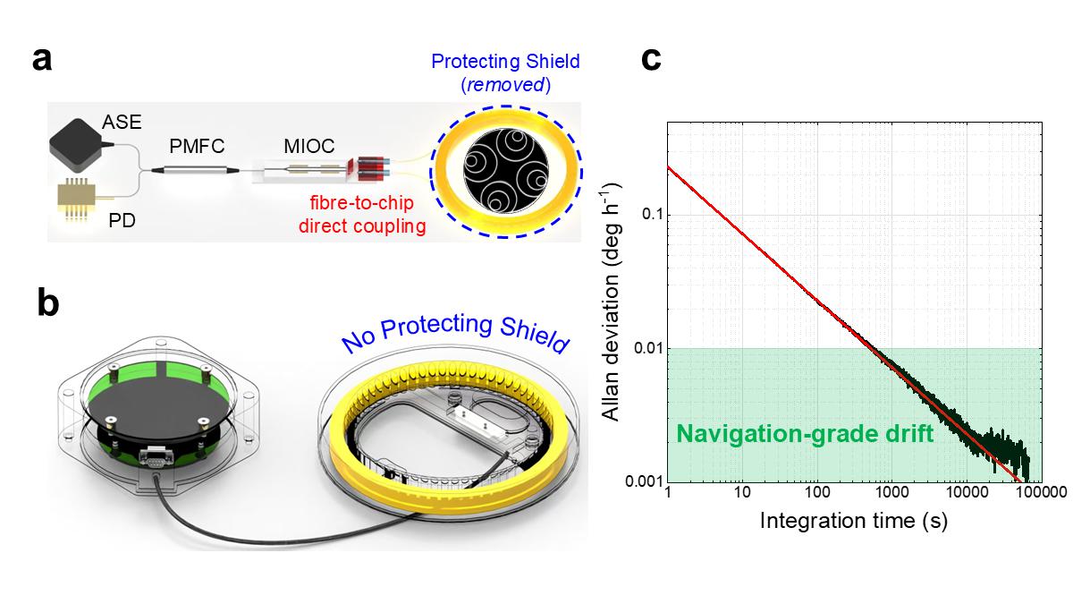 近日,007即时比分-live 007即时比分 (007即时比分 )丁伟研究员、汪滢莹研究员团队与中国船舶集团第七〇七研究所赵小明研究员、罗巍研究员、李茂春研究员团队展开深度合作,在高精度空芯光纤陀螺(Air-core FOG)领域取得重大进展。研究团队成功研制出全球首个导航级精度空芯光纤陀螺,其零偏不稳定性达到0.0017°/h,较现有记录提升了近30倍,样机连续稳定运行超185小时。相关成果以“Navigation-grade interferometric air-core antiresonant fibre optic gyroscope with enhanced thermal stability”为题发表于顶尖期刊Nature Communications。暨南大学为第二完成单位,孙一之讲师、高寿飞副研究员与第七〇七研究所李茂春研究员为论文共同第一作者,丁伟研究员与第七〇七研究所赵小明研究员为共同通讯作者。