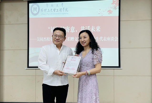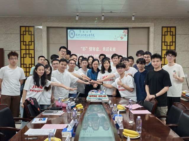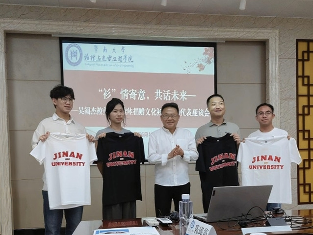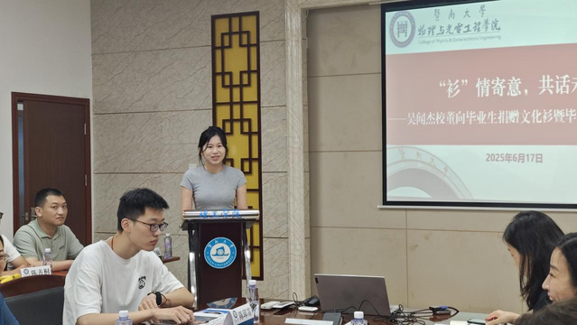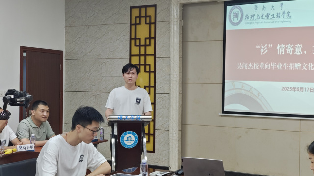 6月17日下午,007即时比分 在蒙民伟理工楼A18会议室举行2025年纪念文化衫捐赠仪式暨毕业生代表座谈会。暨南大学校董、暨南大学教育发展基金会副理事长、007即时比分 校友联谊会创会会长、物理学系1987届杰出校友吴闻杰,对外联络处处长刘毓洁、副处长黄燕如,007即时比分 党委书记黄睿,007即时比分 原院长陈振强教授,光电工程系党总支书记曾庆慧及30余名毕业生代表出席活动。活动由007即时比分 党委副书记孙玉环主持。