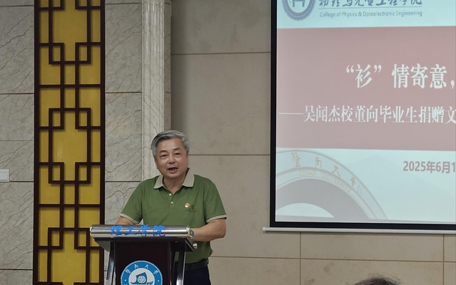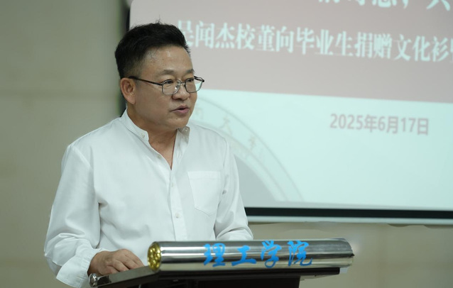吴闻杰校董深情地回顾了四十二年前在暨南园的求学时光。他坦言,积累产业经验后毅然选择下海创业,是暨南人“敢闯敢拼”的精神底色给予他勇气。创业之初,面临着一次次的困难与挑战,他时常以暨南红船精神激励自己,勇敢追波逐浪、无畏航行。捐赠文化衫不仅是个人心意的表达,更是母校永远的牵挂,是暨南精神的火种。希望这件文化衫成为毕业生成长道路上的“见证者”,让学子永远铭记“忠信笃敬”的校训;在遇到挑战时,能感受到母校所传递的温暖与力量;在业界稳固根基时,愿这份“暨南情”成为联结彼此的纽带。最后,他向毕业生们提出了三点建议:一是找到热爱,锚定方向,方能行稳致远。二是深耕能力,筑牢根基,才能让知识迭代跟上时代脚步。三是心怀热忱,传递温暖,用智慧和热情推动社会的进步和发展。