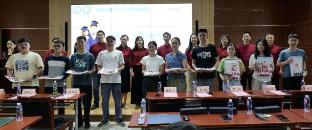 随后,全体领导和老师为毕业生逐一赠送光电人专属毕业纪念品。这份承载着暨南园回忆与院系温度的礼物,是母校对毕业生的牵挂与祝福,愿他们带着“追光逐梦,砺行致远”的信念奔赴远方。