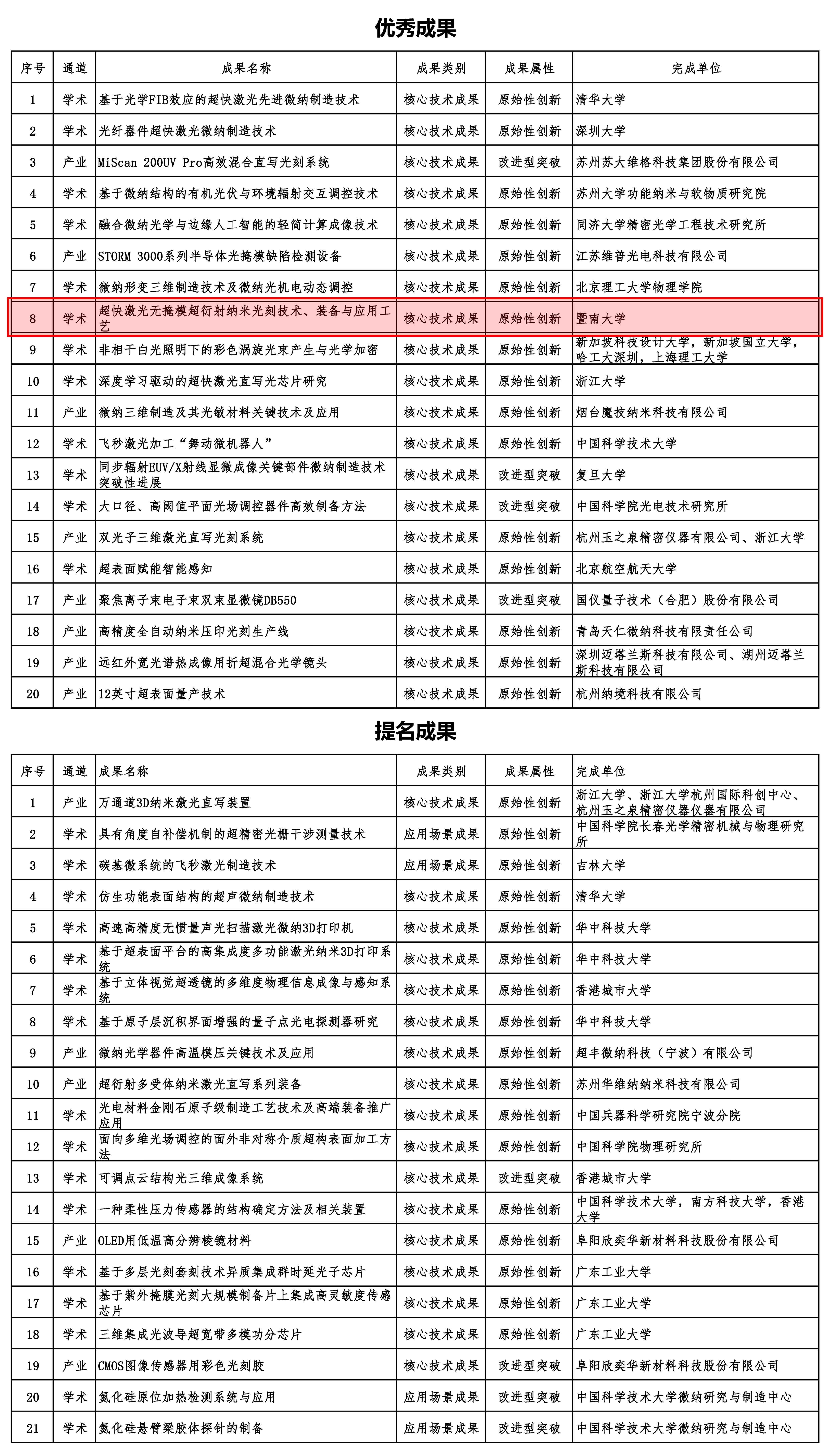 理化技术研究所(郑美玲、董贤子、金峰)研发的系列成果——超快激光无掩模超衍射纳米光刻技术、装备与应用工艺,被评为“优秀成果”,充分展现了团队在新原理纳米光刻领域的创新能力与技术突破。