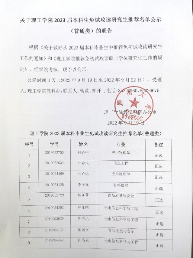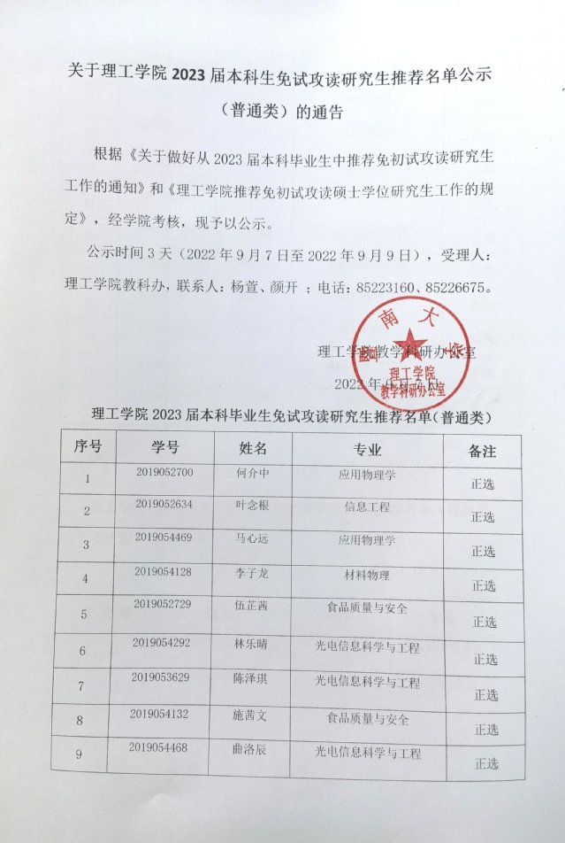 关于007即时比分 2023届本科生免试攻读研究生推荐名单公示(普通类)的通告