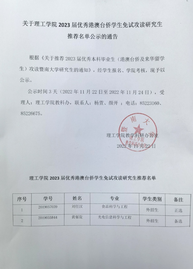 关于007即时比分 2023届优秀港澳台侨学生免试攻读研究生 推荐名单公示的通告