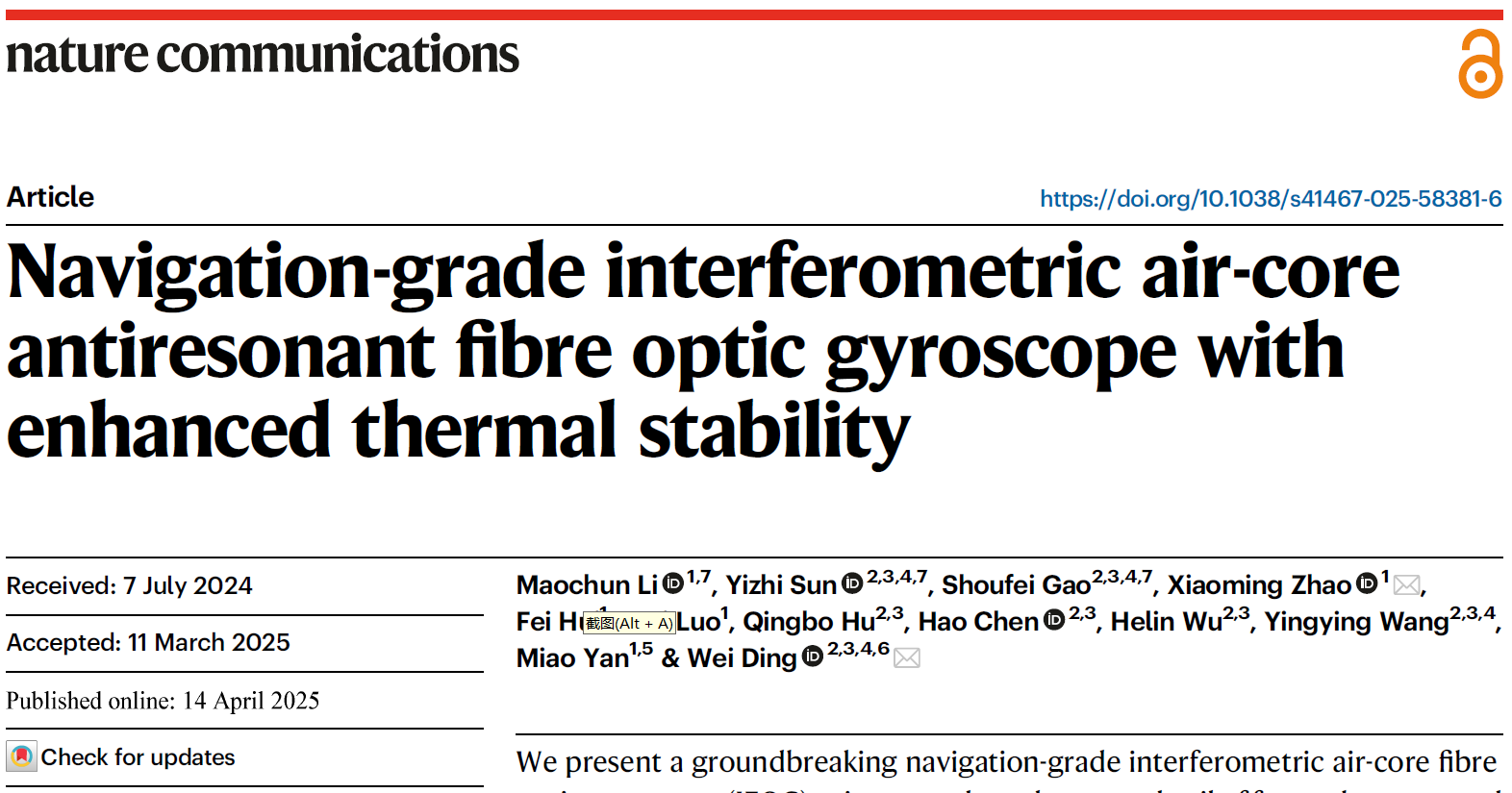 丁伟/汪滢莹团队在高精度空芯光纤陀螺研究中取得重大突破——与中国船舶集团第七〇七研究所合作成果发表于Nature Communications