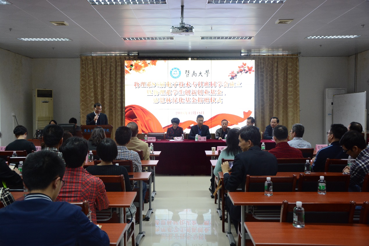 12月18日下午3:00,暨南大学007即时比分 物理系86届电子技术专科班同学会成立暨物理系学生创新创业基金、感恩林绿化基金捐赠仪式在007即时比分 103会议室隆重...