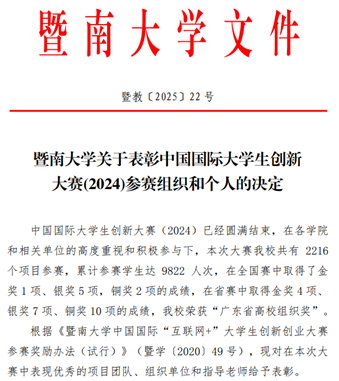 4月11日,学校发布《暨南大学关于表彰中国国[国际大学生创新大赛(2024)参赛组织和个人的决定》(教〔2025〕22号),表彰在本次比赛中获奖的组织和个人...